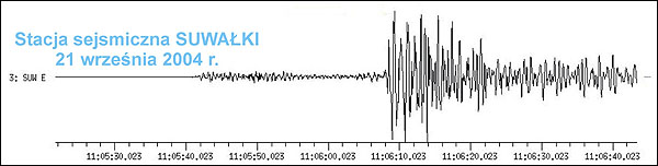 Fragment zapisu sejsmografu z Suwałk (czas uniwersalny GMT) |