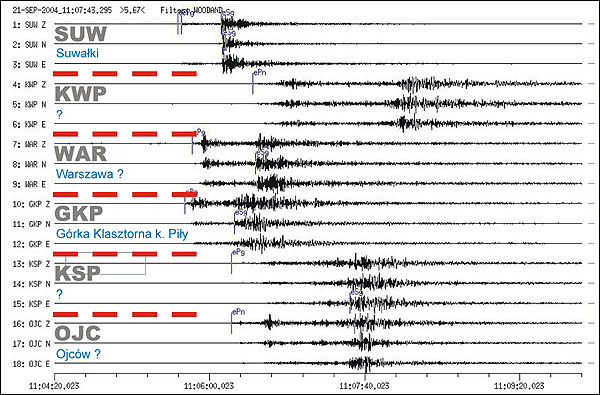 Fragment zapisów z kilku polskich sejsmografów; nie znam miejsc (czas uniwersalny GMT) |
