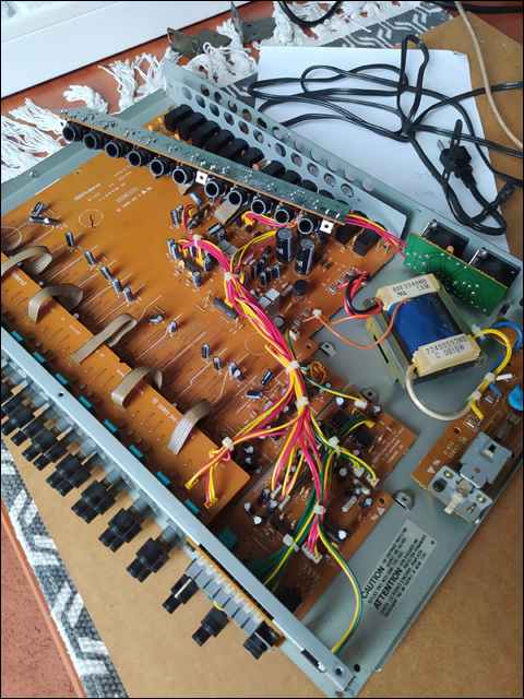 ilość punktów lutowniczych zwłaszcza przy elementach narażonych na oddziaływania mechaniczne - gniazda wejściowe/wyjściowe, potencjometry, przełączniki. Sprzęt jest jak nowy pomijając rysy i wgniotki na obudowie. Kilka zdjęć z naprawy Niestety - aby dostać się do PCB w celu demontażu/montażu trzeba odkręcić wiele