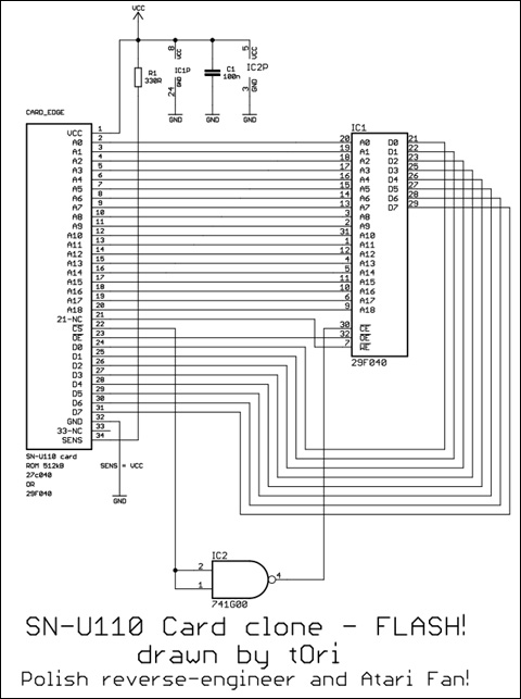a programator wystawia poziom niski :) Taka sytuacja... Odczyt karty jest bezproblemowy i potem wystarczy zapisać plik binarny, który przyda się do uruchomienia klona. Karty - oryginalna i klon Schemat klona karty SN-U110 Jest to także bardzo prosty układ. I tutaj także została zastosowana pojedyncza